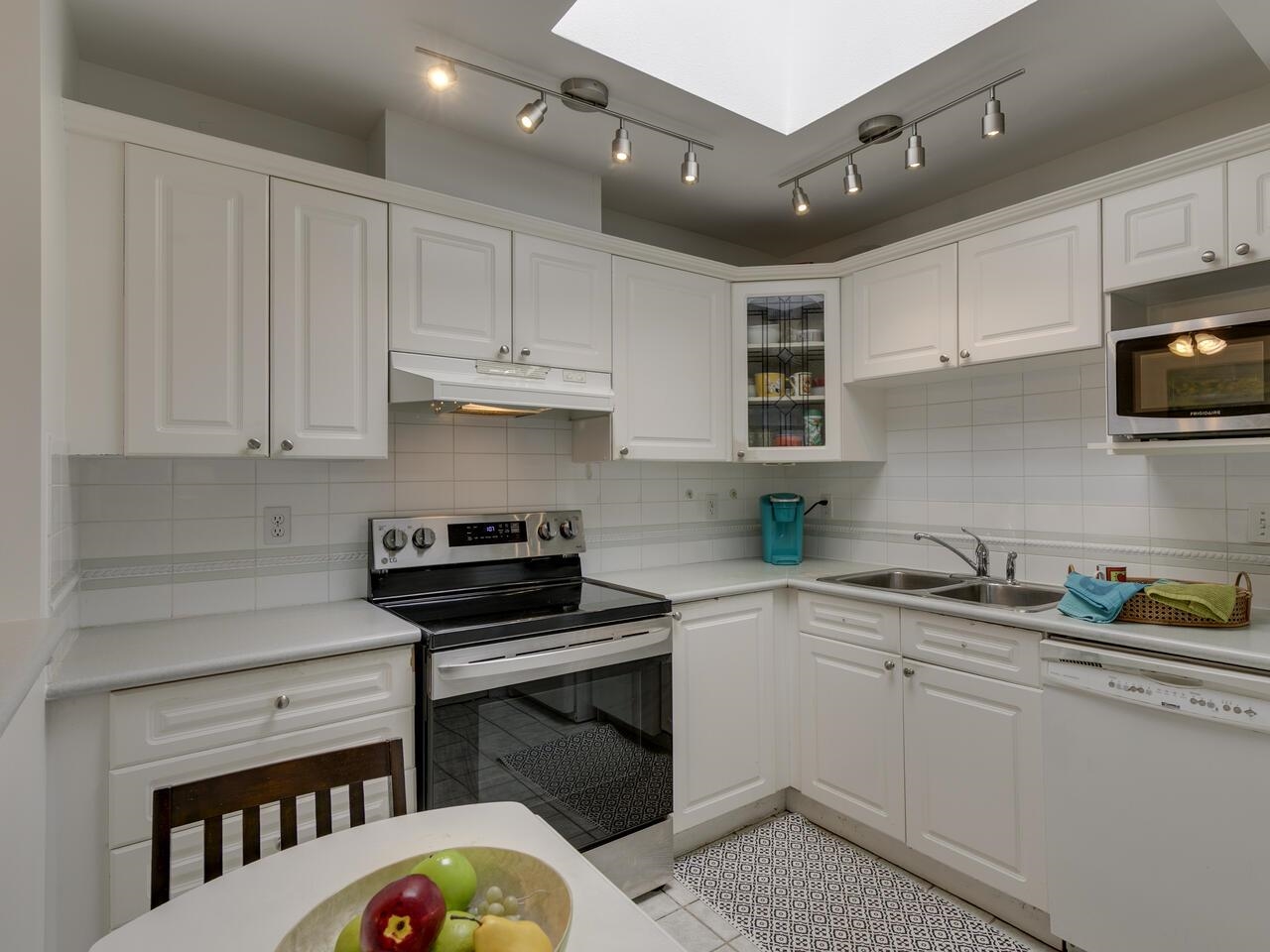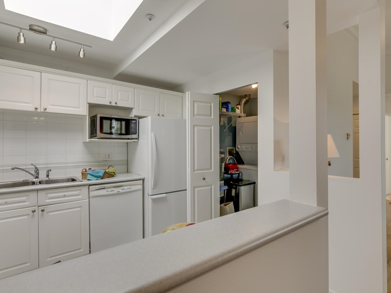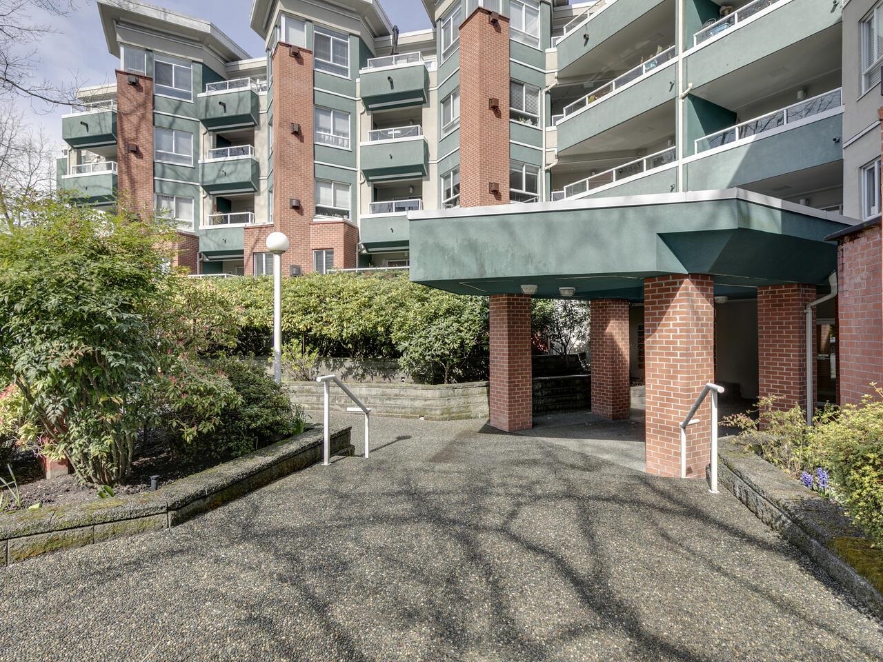 The Library offers a great central Lonsdale location for this meticulous top-floor, two-bedroom/two-bathroom home. Offering 1,068 sq. ft. of freshly painted living space, the vaulted ceiling and skylights fill the area with natural light. Generous living & dining rooms are perfect for entertaining, opening to a spacious Trex balcony. Kitchen has ample counter space & cupboards. A separate laundry room offers tons of storage. Large primary bedroom has an ensuite featuring a walk-in shower, double sinks, and a walk-in closet. Second full bathroom with a soaker tub. Includes one parking stall and l storage locker. Building amenities include a gym, bike storage, and a meeting room. With a walk score of 93, this location is a walker's paradise! Steps to public transit & Victoria Park